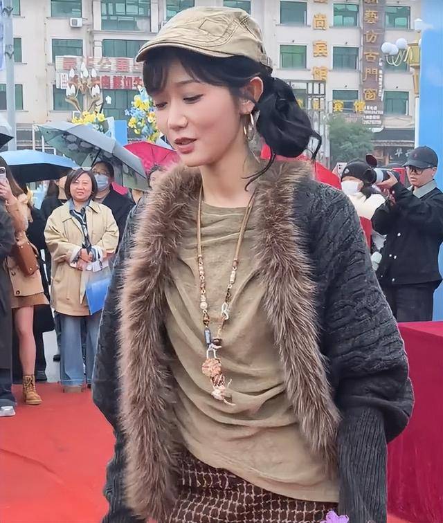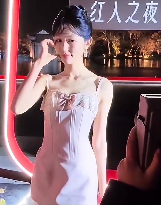 当天杭州天气不算冷,红毯上的女星们不是精致礼服就是干练套装,个个争奇斗艳,唯独岳雨婷显得格格不入。