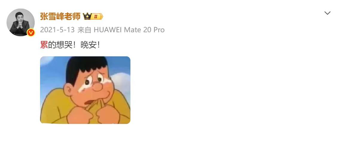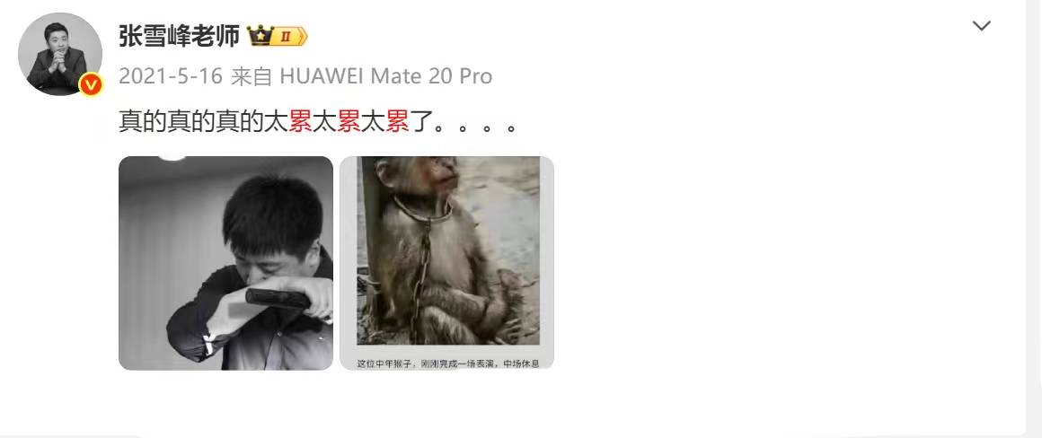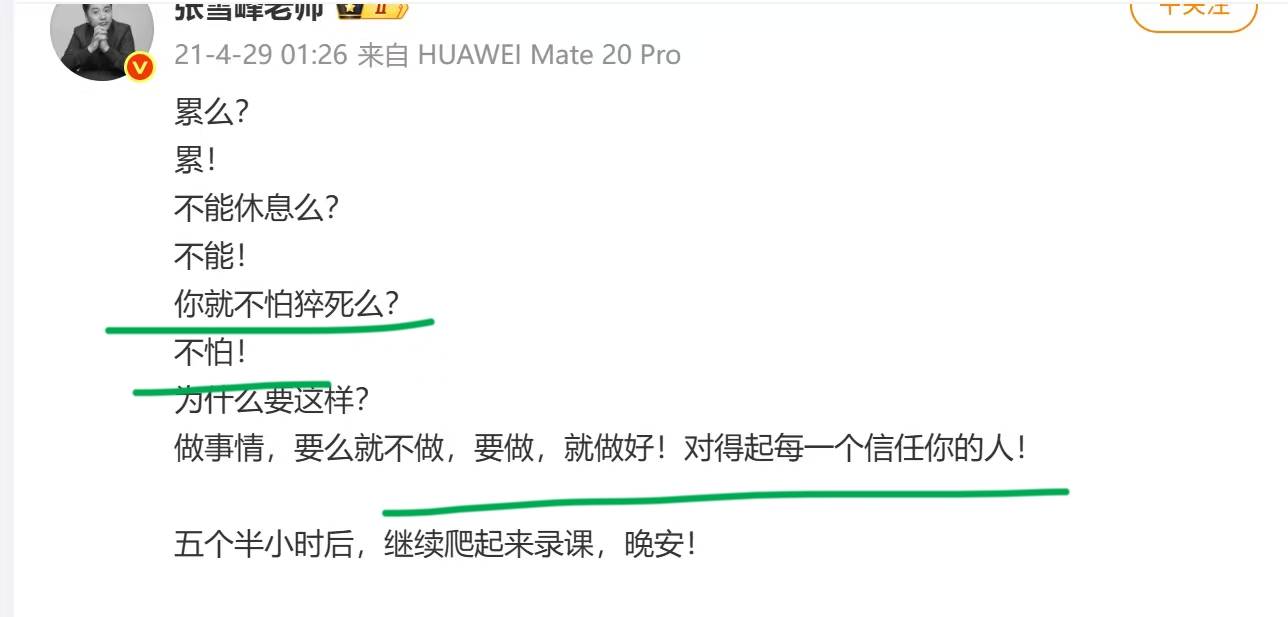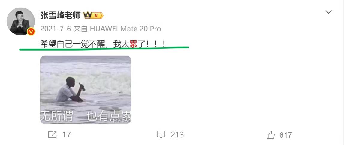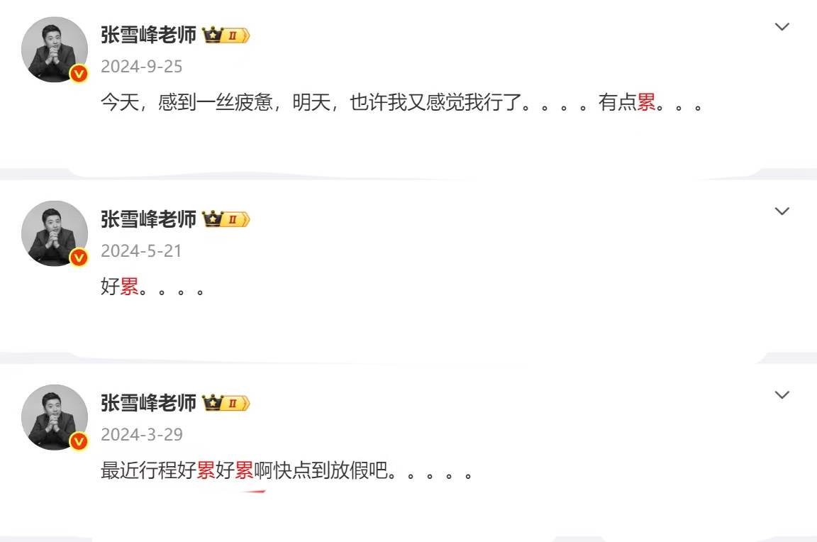翻看他的社交账号,输入关键词“累”你会发现,过往创业这些年,张雪峰发出过不下50次的“太累了”、“我有点累”、“好累”、“累得想哭”。