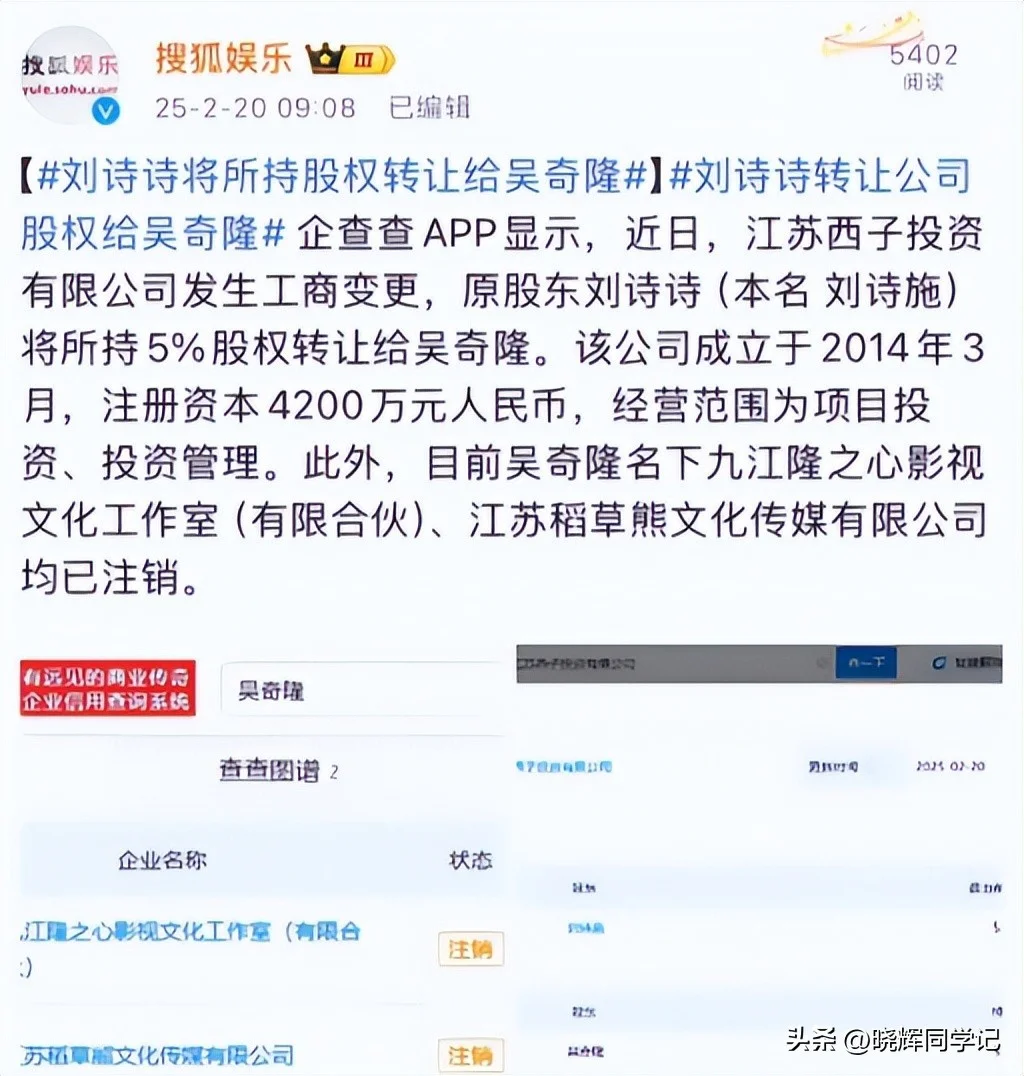 尤其是2025年刘诗诗将其名下公司的部分股权转让给了吴奇隆。