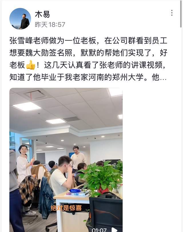 有一位其生前的员工特地分享了一段视频,有两位同事在群聊中希望得到魏大勋的签名,而张雪峰便将其放在了心上,不久后就成功为其实现。最让人感到戳心的是,他为员工永远储备半年的工资。