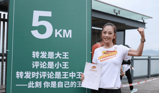 轻松跑完5公里的陈松伶,她站在“5KM”绿色里程牌旁拍照,看向镜头的陈松伶面带灿烂笑容,左手握拳高举,右手持完赛证书,展现出完成赛段的自信与喜悦。