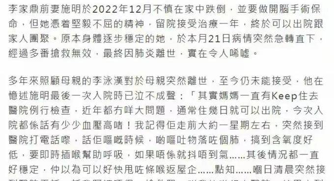 在一个采访中,李泳汉 描述了他母亲 生命即将结束时的 遭遇, 他的话语中充满了深深的懊悔。 施明 此次 入院 的主要原因 是他的血压 略高 。在医院 的调理 过程中, 他在呕吐时不 慎吸入 了异物,导致 病情 迅速恶化。 当医院 致电 告知他时,他拼 尽全力赶往医院, 但到 达后, 他的母亲已经 离开了。 他 提到, 他甚至没能看到母亲 的最后一面, 因为母亲 的离去太过突 兀,没有留下 任何话语。 那种 因为时间紧迫而无法道别的遗憾, 也让听 者内心 感到一阵酸 楚。