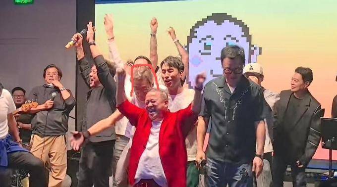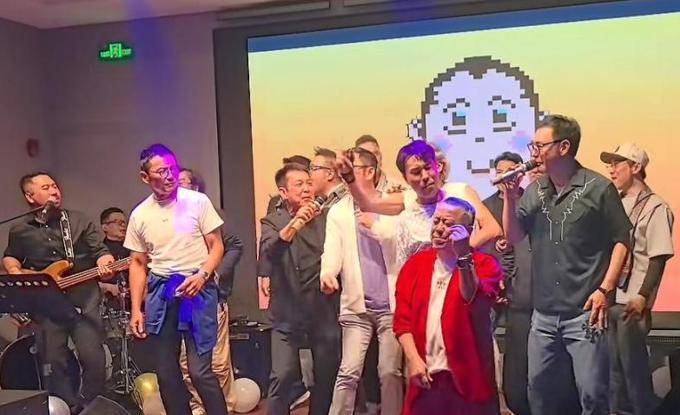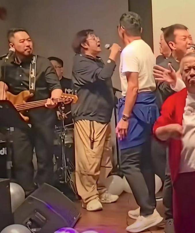 最出乎众人预料的是元彪。洪金宝和成龙的年轻师弟,在电视屏幕上总是展现出硬朗的功夫小生形象,但谁能想到他私下里的热情也如此高涨。在视频中,他唱得非常投入,他的胳膊直接搭在了吴启华的背上,吴启华也毫不含糊地接住了他的肩膀,两人一同高声对唱。