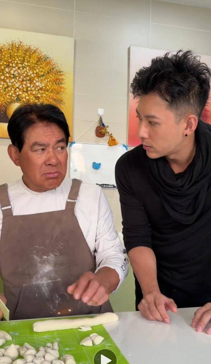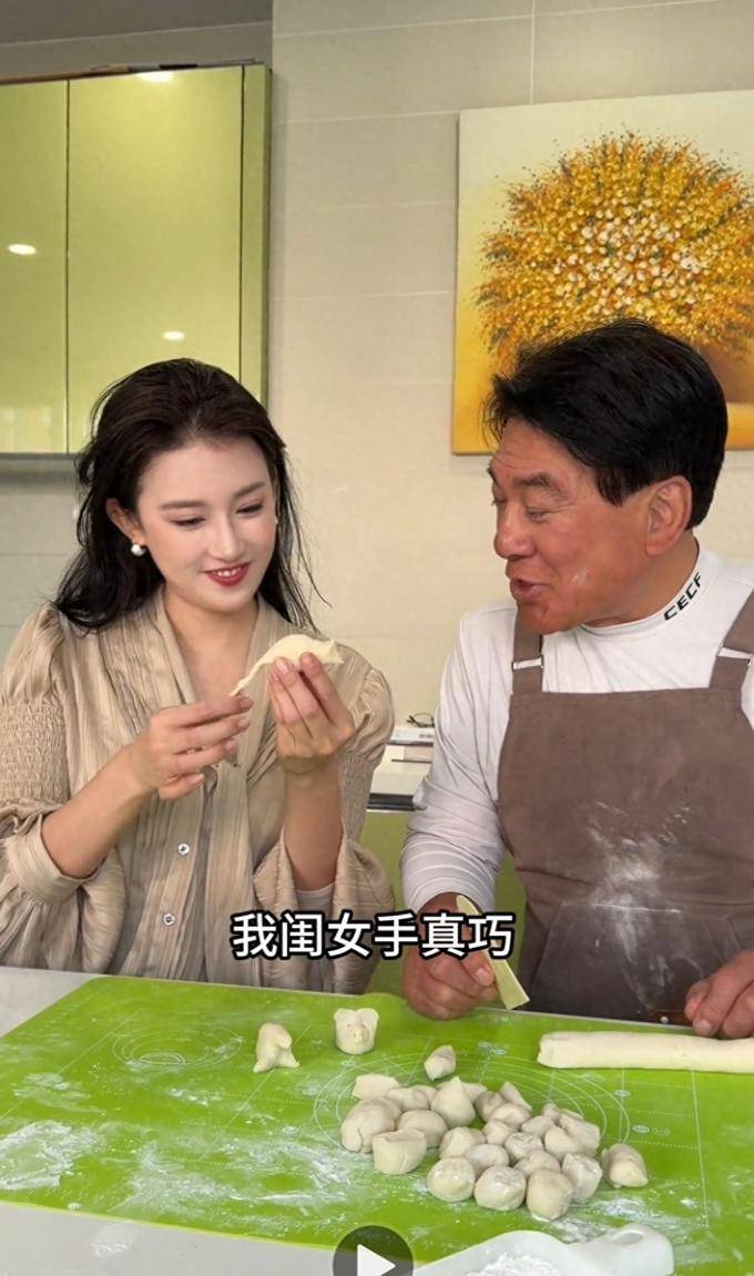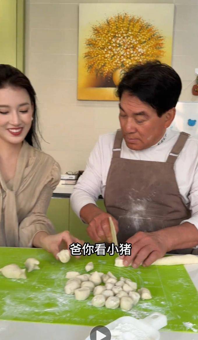朱时茂穿着棕色围裙,脸上有白白的面粉,他在厨房里擀饺子皮,旁边的“女儿”举着用面团捏的小猪和穿山甲,用很娇气的声音叫他爸爸,朱时茂听了眼睛笑得眯成一条缝,一直夸女儿手真巧,还问女儿想吃什么馅儿。