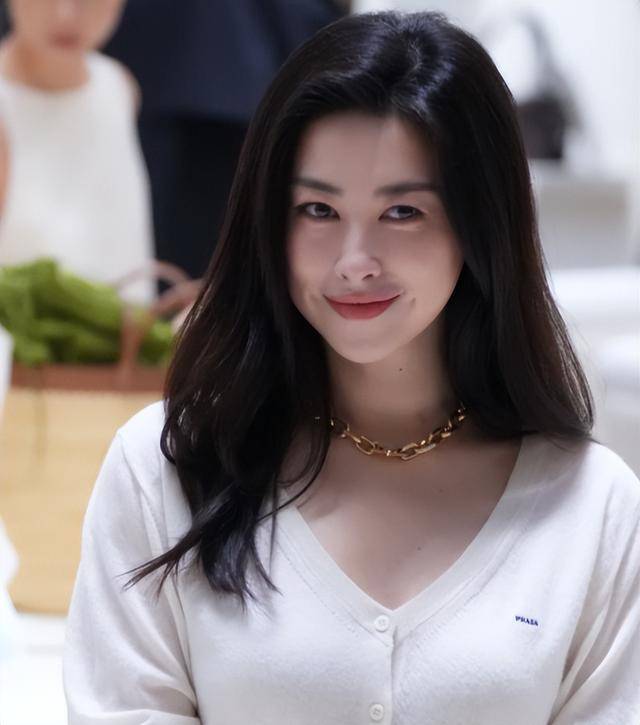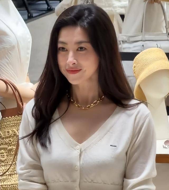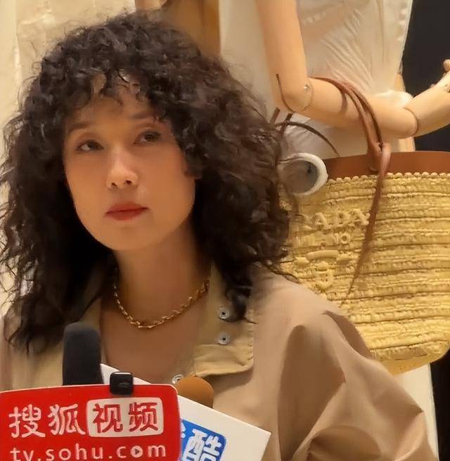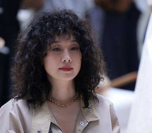 她留着乌黑长卷发,随风飘动,衬得脸温柔大气,脸上没有过度磨皮,眼角细纹清晰可见,却更添成熟韵味。