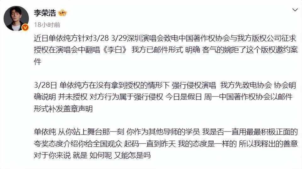 或许也是这次开始,李荣浩拒绝再将《李白》的版权授予单依纯团队。