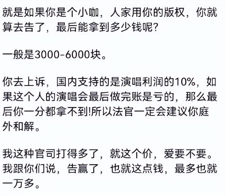 就算后期上诉了,根据相关法律条款,赔偿大概是演唱利润的10%,可提供的“利润”有很大的水分可以操作。