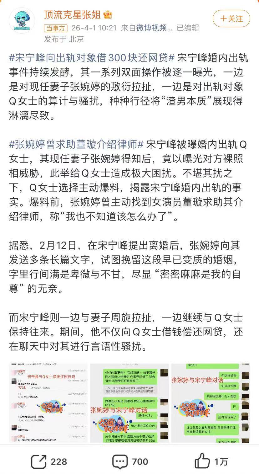 张婉婷在公开指责齐溪的同时,自己的婚姻也面临危机。2026年3月,宋宁峰被爆婚内出轨,而张婉婷却将矛头指向第三者而非丈夫,这种处理方式与她对待齐溪的态度有相似之处。
