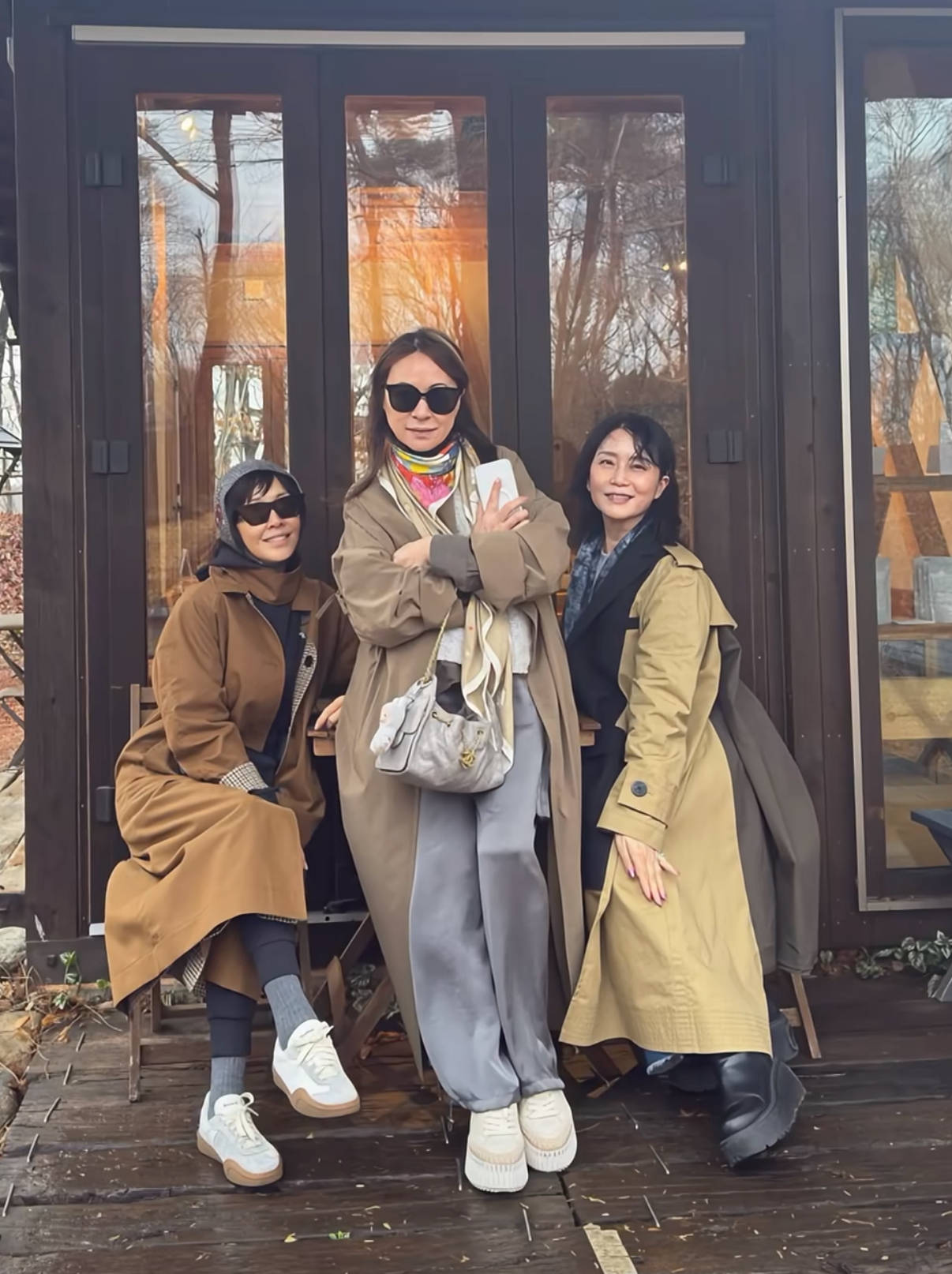 虽然已经是春天了,但当天的气温不是很高,刘嘉玲穿了一件厚实的棕色风衣外套,还戴着灰色帽子、墨镜,打扮得飒美又保暖。