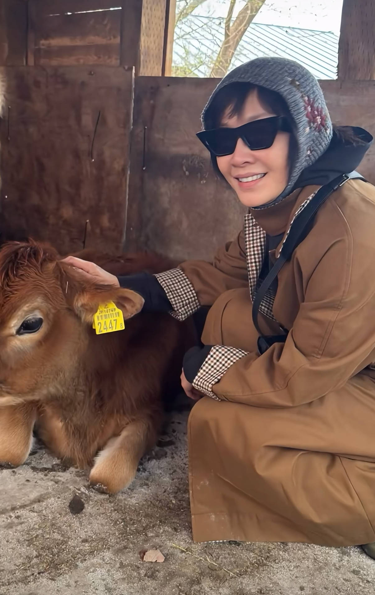 作为大明星,刘嘉玲平时可能接触不到这样的小动物。她甚至把牛犊抱在怀里,也不在乎地上的牛粪。