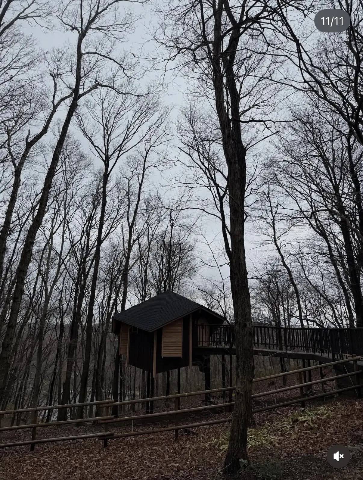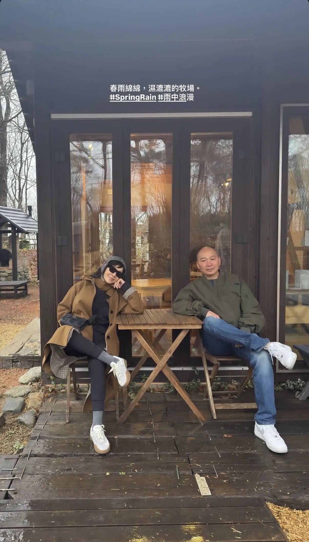 当天不仅没有阳光,还像是刚下过淅淅沥沥的小雨。在刘嘉玲所站的木桥上,都是湿漉漉的。这样的环境,这并不影响刘嘉玲一家度假的好心情。
