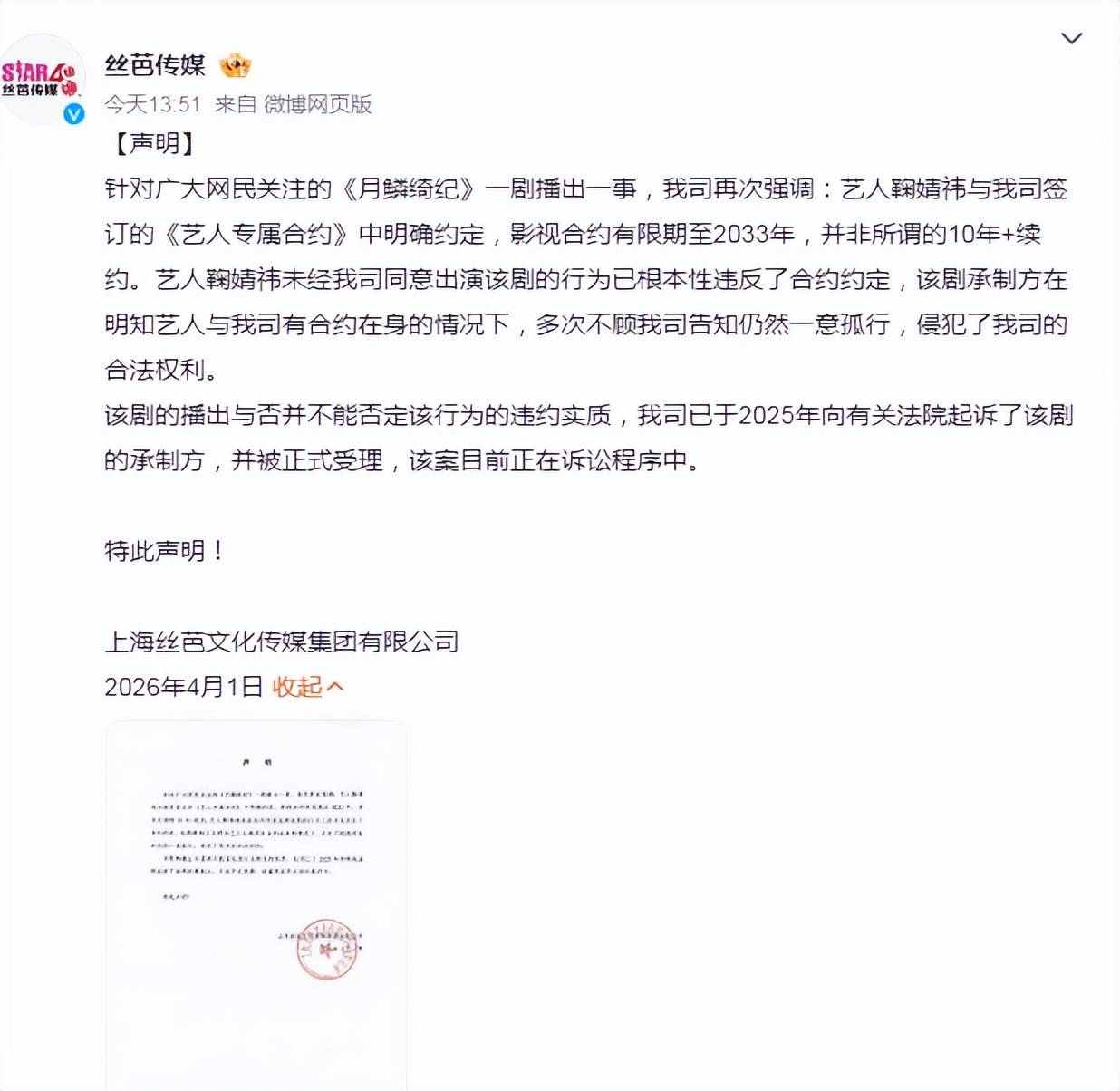 2026年4月1日,丝芭传媒发布声明起诉《月鳞绮纪》承制方,指控剧方明知鞠婧祎存在合约纠纷仍坚持拍摄构成侵权,但剧集仍如期在优酷开播,引发热议!