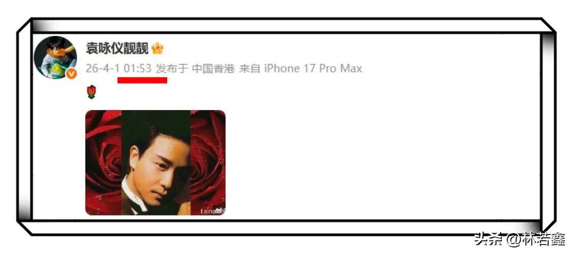 凌晨1:53,大家都在熟睡的时候,袁咏仪在网上晒出一张张国荣的照片,配了一朵玫瑰花的表情,悼念好友张国荣,袁咏仪已经连续好几年晒照惦念小哥,不得不说袁咏仪也是重情重义的人!