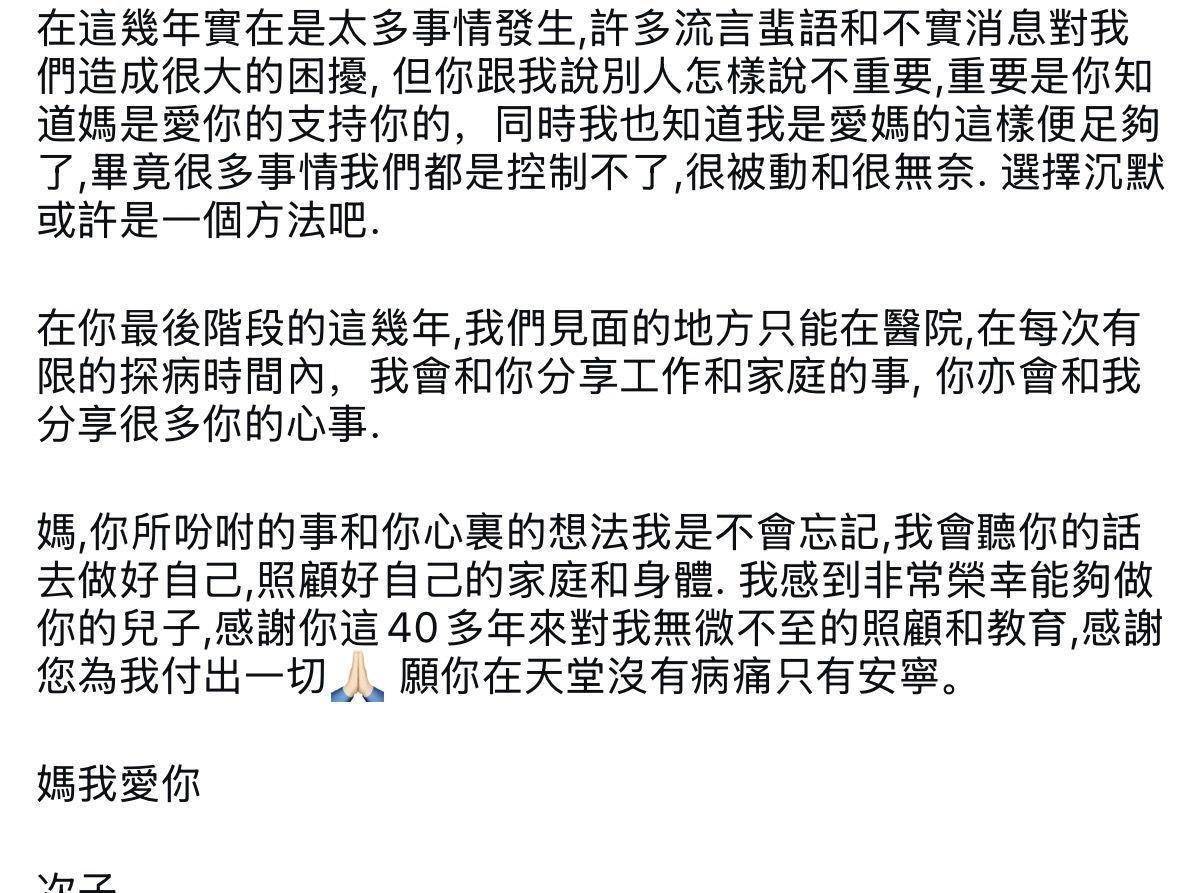 “你跟我说,别人怎样说不重要,重要的是我知道妈是爱你的。 ”李泳豪在文中否认“母子不和”的传闻。 但他也承认,母亲人生的最后这几年,母子见面只能在医院。