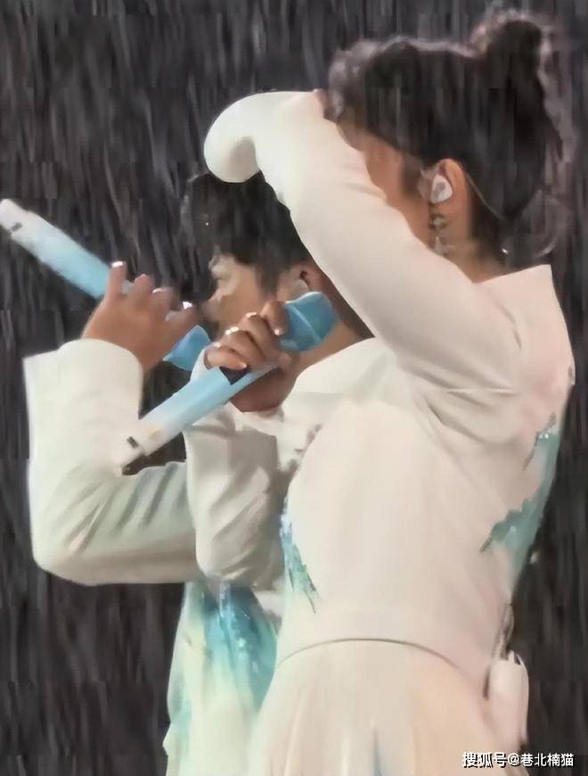 换作其他艺人,大概率会紧急散场、退至后台避雨,可玲花和曾毅,半步未退。玲花银色演出服被雨水浸透,发丝流水模糊双眼,唱歌间隙还要侧头吐掉嘴里的雨水;曾毅短发湿透,说唱时甚至会喷出雨水,节奏却稳如录音棚。