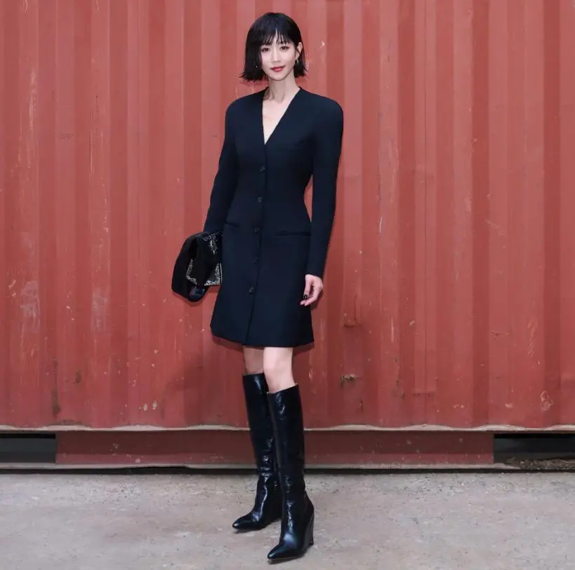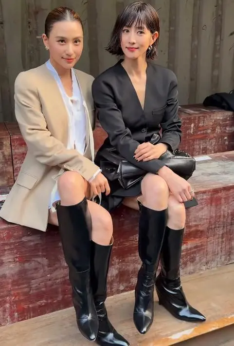 两人都穿了同一款黑色坡跟长筒靴,却穿出了不同感觉。