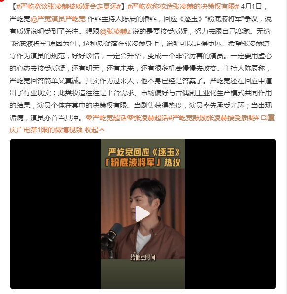 最近,严屹宽在回应《逐玉》"粉底液将军"争议时,他强调张凌赫对化妆造型的决策权受限于平台需求、市场偏好和古偶剧工业化模式,并鼓励其将质疑转化为成长的动力。