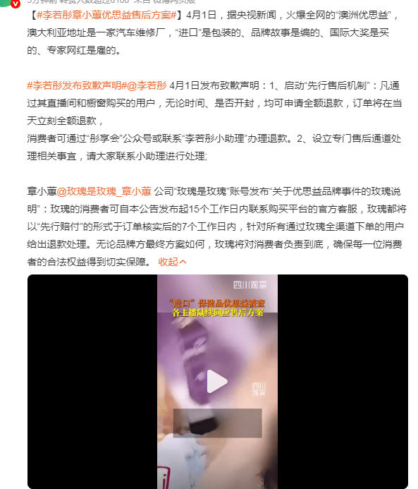 李若彤因带货的保健品品牌"优思益"被央视曝光全链条造假,她于2026年4月1日通过官方渠道发布致歉声明,承认选品失职并启动无条件全额退款。