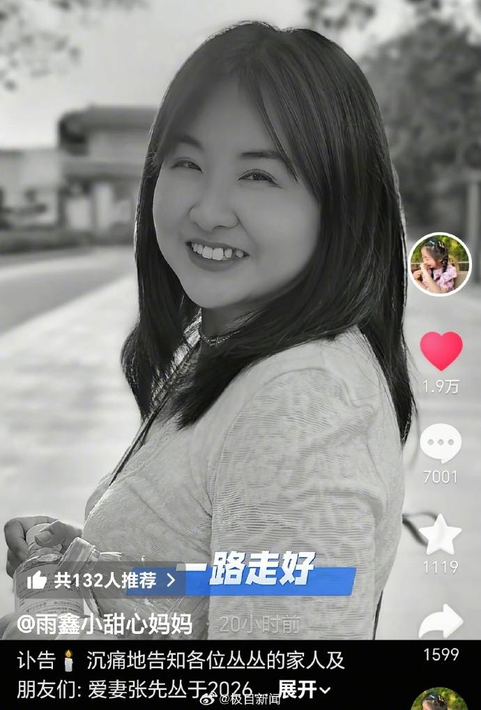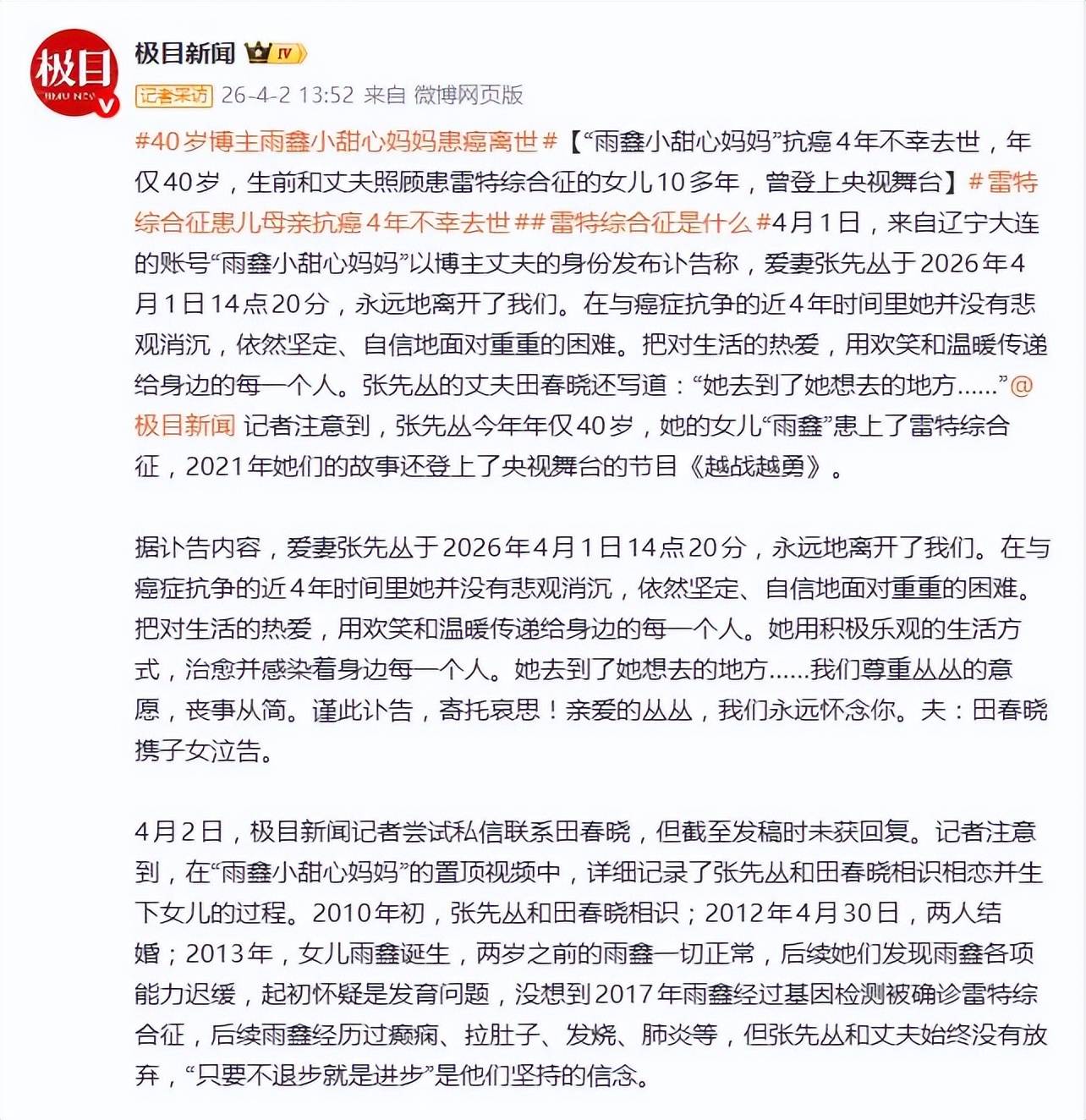4月1日,账号“雨鑫小甜心妈妈”由丈夫春晓发布了一则泣告。讣告中写道,爱妻张先丛于2026年4月1日14点20分离世。在与癌症近四年的搏斗中,她从未悲观消沉,而是以坚定和自信面对重重困难,将对生活的热爱化为欢笑与温暖,治愈并感染着身边的每一个人。讣告末尾那句“她去到了她想去的地方……”,寄托着家人无尽的哀思与祝愿。
