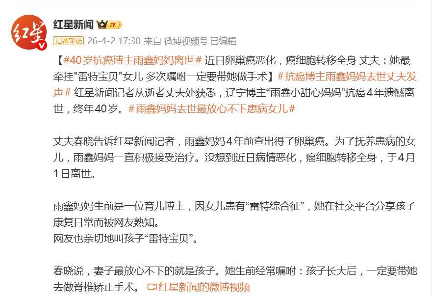 据4月2日报道,一则来自辽宁的消息让无数网友心碎。记者从逝者丈夫处证实,备受关注的育儿博主“雨鑫小甜心妈妈”在与卵巢癌抗争四年后,于4月1日遗憾离世,生命永远定格在了40岁。