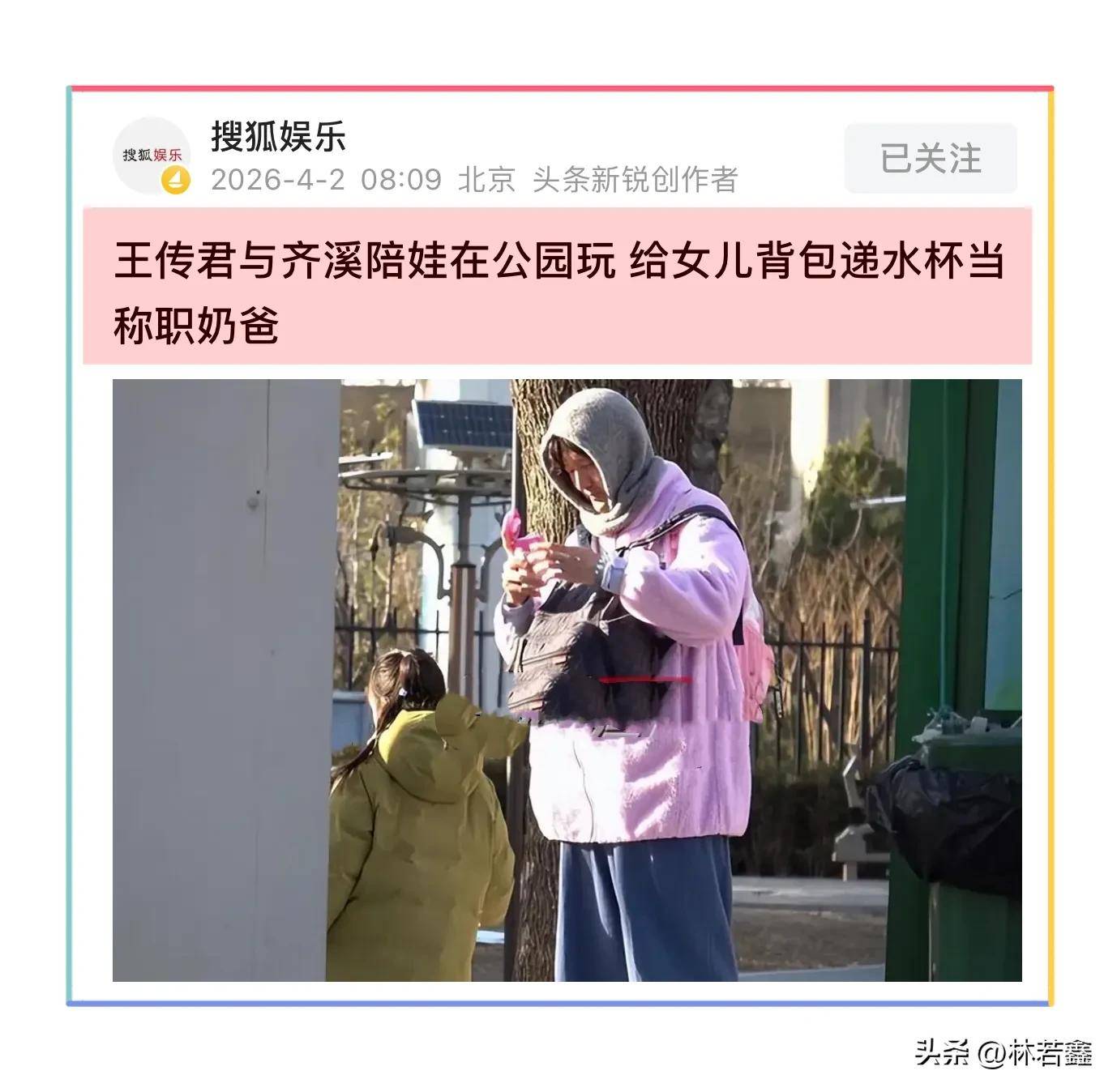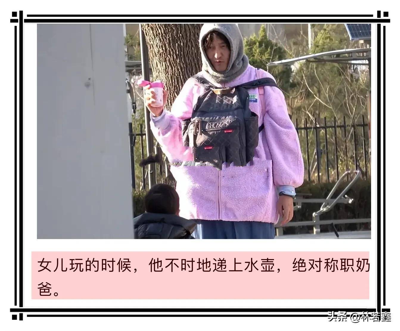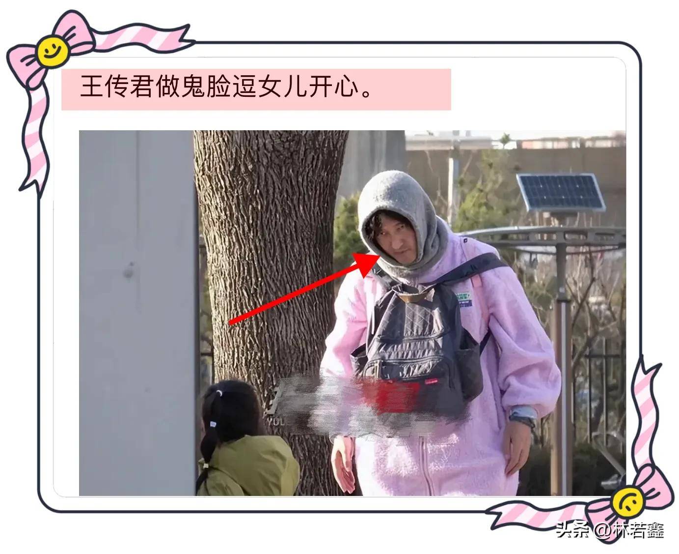 王传君穿着粉色长款外套,搭配阔腿裤,整个人看上去松弛感十足,十分接地气,一点明星架子都没有,王传君前面背着老婆的包包,后面背着女儿的包包,全程围着女儿转,妥妥的好爸爸,好老公!