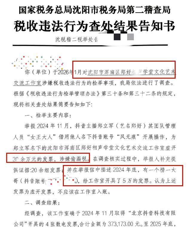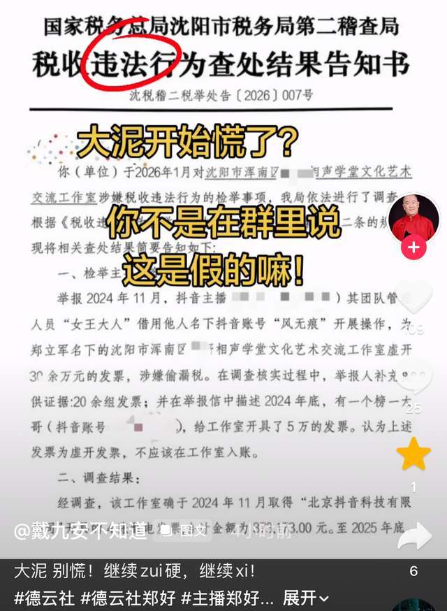 前德云社艺人戴九安在小号上公开分享了一则税收违法查处结果告知书,上面显示的内容便是郑好于沈阳成立的工作室。
