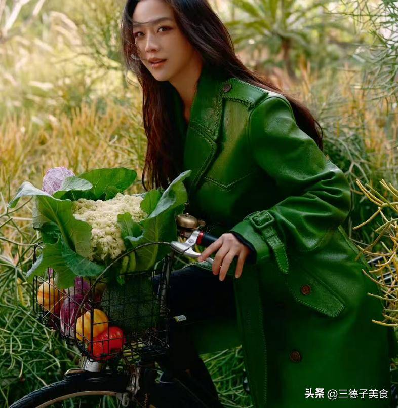 汤唯一身翠绿色的皮质大衣,身下骑着一辆自行车,穿梭在充满生机的菜园里,看着就很美。
