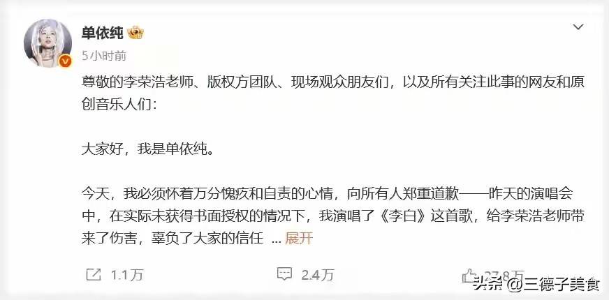 本来李荣浩以为自己拒绝了就算了,可谁成想,单依纯明明在知道没授权的情况下,还硬是唱了改编版的《李白》。