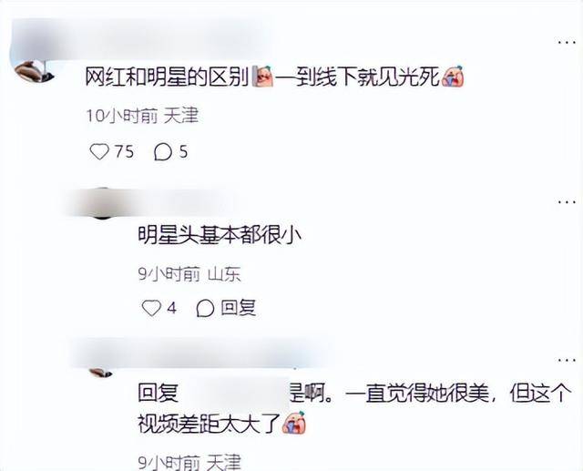 有路人直言美伢线下看着脸特别大,完全不是视频里的小头小脸,也有网友感慨,明星的头普遍都很小,头肩比的优势,网红再怎么包装也比不了。