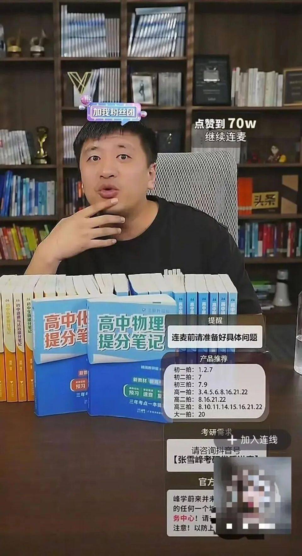 张雪峰直播时,面前就会摆上一排教辅书,答疑时也会向家长推荐。