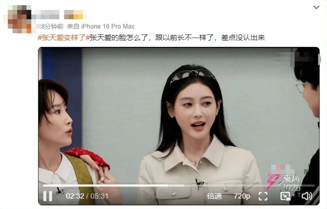 2日,张天爱作为谢楠的“乘风送考人”亮相《乘风2026》初见面直播,有网友发现张天爱的面貌与之前相比有些不同,引发热议!随后,“张天爱变样了”话题登上热搜榜。