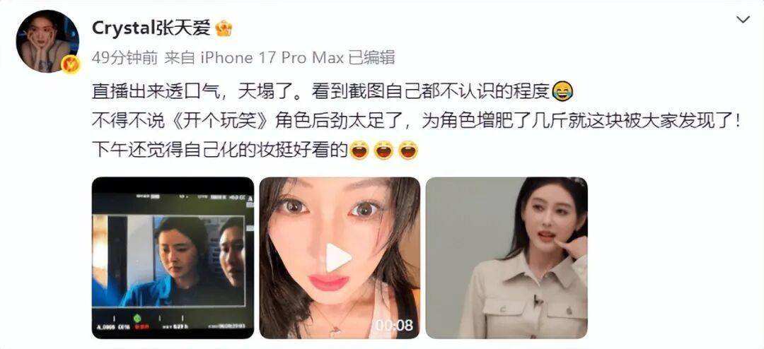 当晚,张天爱晒照并发文回应称自己是因为角色需要增肥,导致容貌有些变化,还调侃“看到截图自己都不认识的程度”。