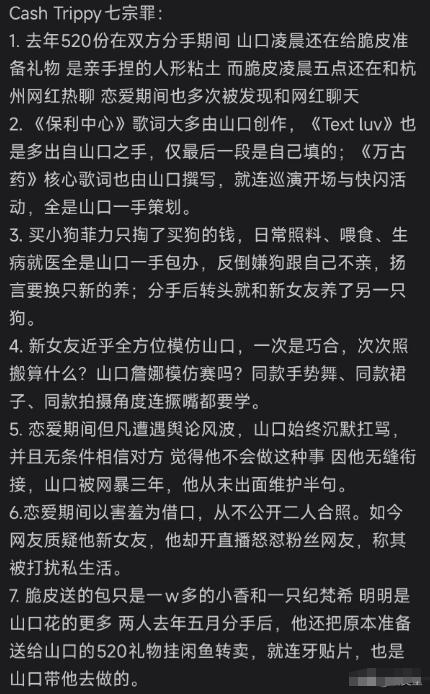 这场爆料来得猝不及防,山口詹娜在直播里,毫无保留地讲出了大量和 CASHTRIPPY 相关的私密事,桩桩件件都极具冲击力。