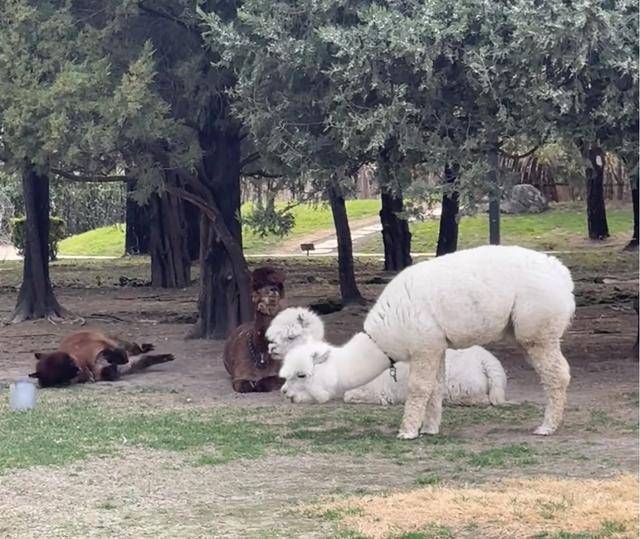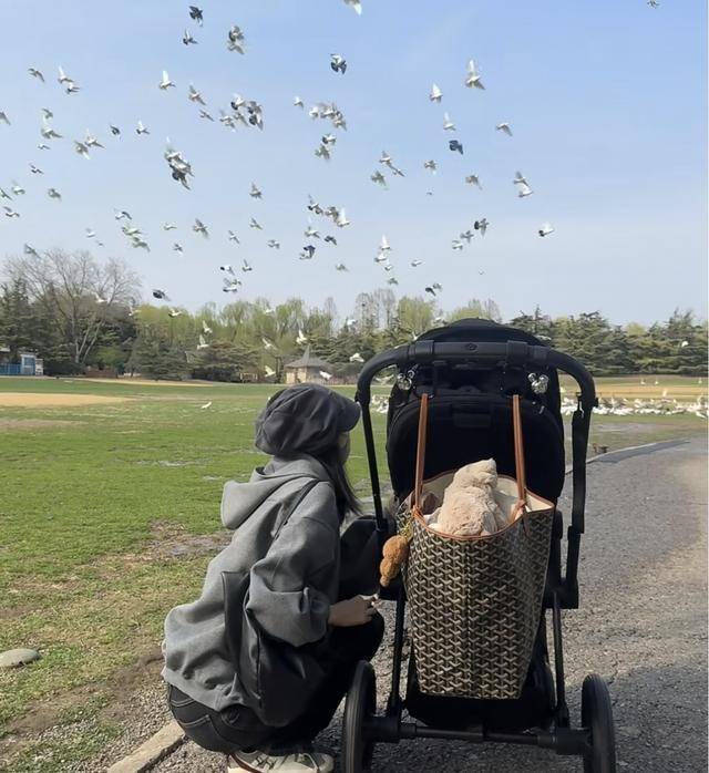 在户外庄园里,有羊驼和小马,天气晴好,适合踏青,还有成群的鸽子。何穗戴着帽子,身穿灰色外套搭配黑色牛仔裤,打扮休闲,宝宝坐在婴儿车里。看到鸽子飞过,她还指给儿子看,场面温馨而自然。