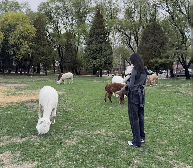 当宝宝坐腻了婴儿车,何穗便用背带背着他,带他去观察小动物吃草。尽管她穿得低调,但高挑的身材、纤细的线条和优雅气质仍让人忍不住多看几眼。