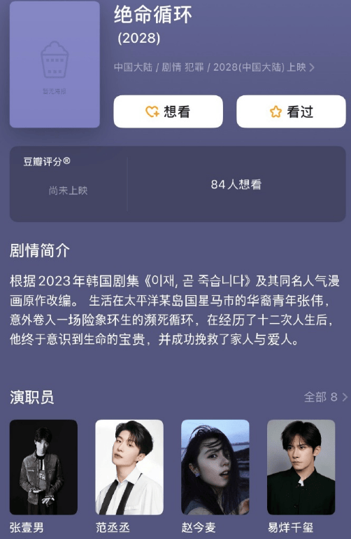 导演张壹男为张艺谋长子,此前多从事幕后工作,此次独立执导院线长片备受瞩目。改编自2023年韩剧《死期将至》(原剧豆瓣8.3分),涉及奇幻悬疑与人性探讨。