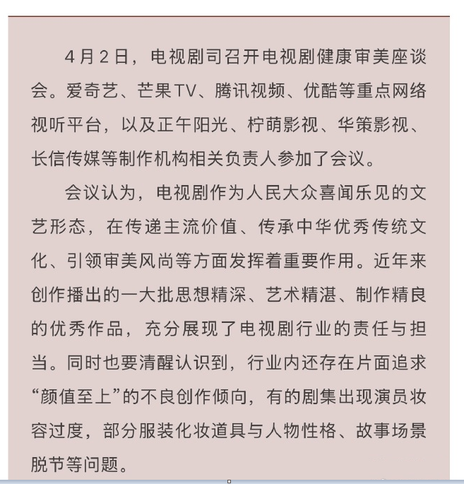 会议指出当前行业存在三大乱象:演员妆容过度精致化,例如古装武将涂粉底、描红唇,现代工人戴美瞳;服化道设计与角色身份、剧情场景严重割裂;以及创作逻辑陷入"颜值崇拜"和"流量依赖"。