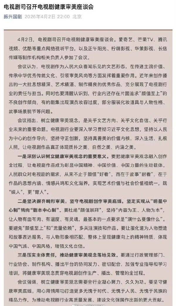 广电总局电视剧司于4月2日紧急召开"电视剧健康审美座谈会",首次以官方名义点名批评部分剧集存在演员妆容过重、服化道与角色设定严重脱节等问题,明确提出"演什么要像什么"的核心要求,引发全网对"粉底液将军"现象的集中讨论。