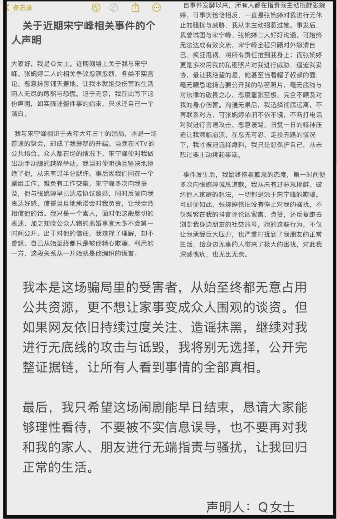 随着男星宋宁峰承认出轨并无限期暂停演艺工作,闹得沸沸扬扬的美女明星收割机出轨风波似乎就此完结,然而等到网友扒出小三Q女士的社媒,整件事就复杂了起来,最新进展为Q女士真实身份曝光,她本人也发文回应了。