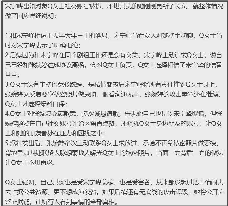 总结一下Q女士回应重点,她强调宋宁峰在大年三十酒局先动手动脚,自己明确拒绝了,二人在同一个剧组工作,被拒绝的宋宁峰不肯放弃,透露和张婉婷签了离婚协议,会对她负责,Q女士才选择相信。