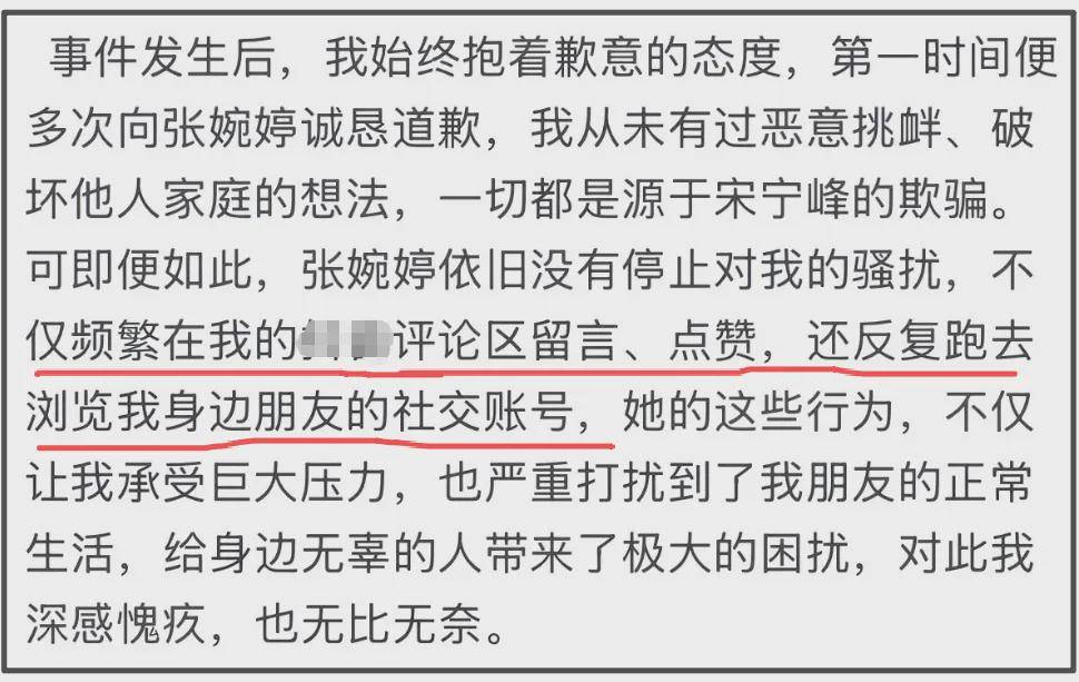 只不过比起宋宁峰,Q女士明显对宋宁峰妻子张婉婷更有情绪,强调自己和张婉婷多次道歉,但张婉婷还是不肯放过她,一边用曝光私密照片威胁,一边去Q女士社媒点赞留言,还会浏览Q女士朋友账号。
