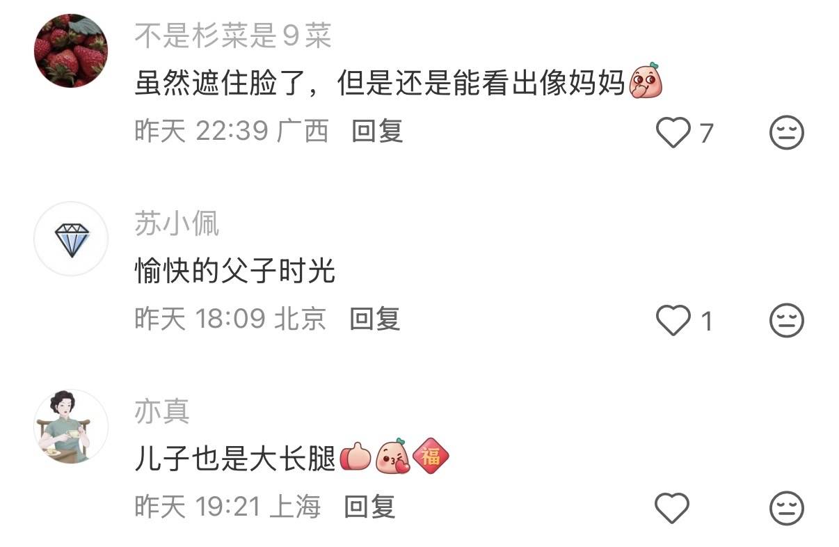 还有网友评论,虽然遮住了脸,但还是可以看出尤利斯的长相更像妈妈。尤其是嘴巴,简直和妈妈一模一样。而尤利斯也是和爸爸一样的大长腿,未来身高也差不了。