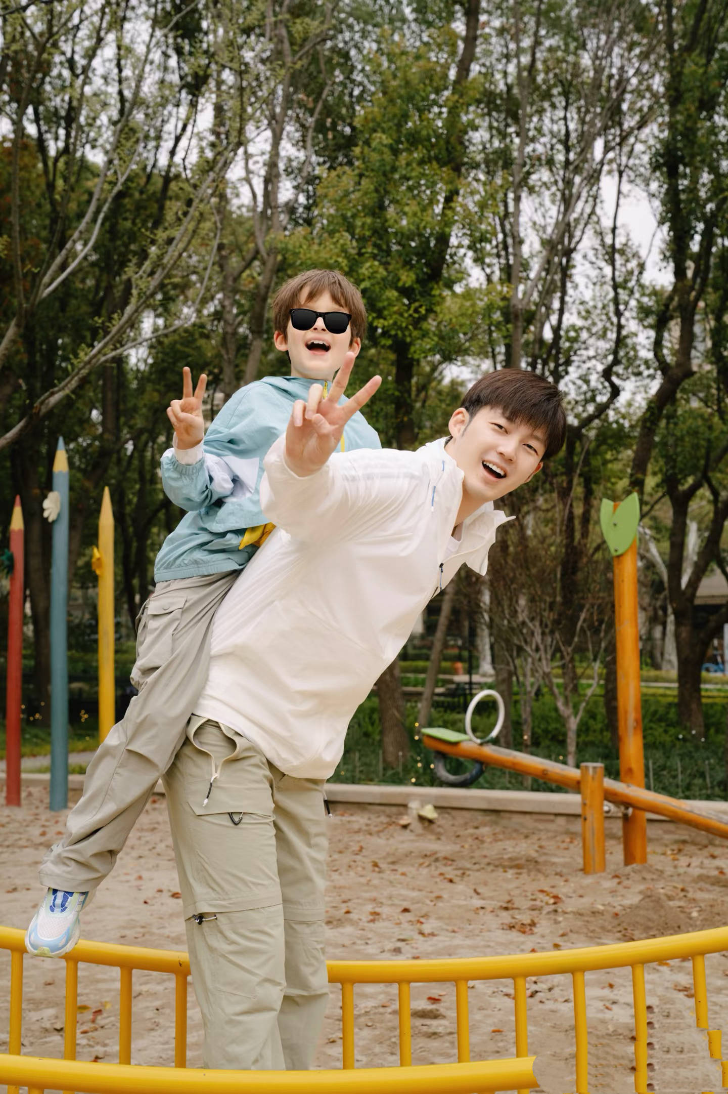 父子俩在一起的时光很快乐,他们穿同款外套、同款的工装裤,打扮的清爽干净。