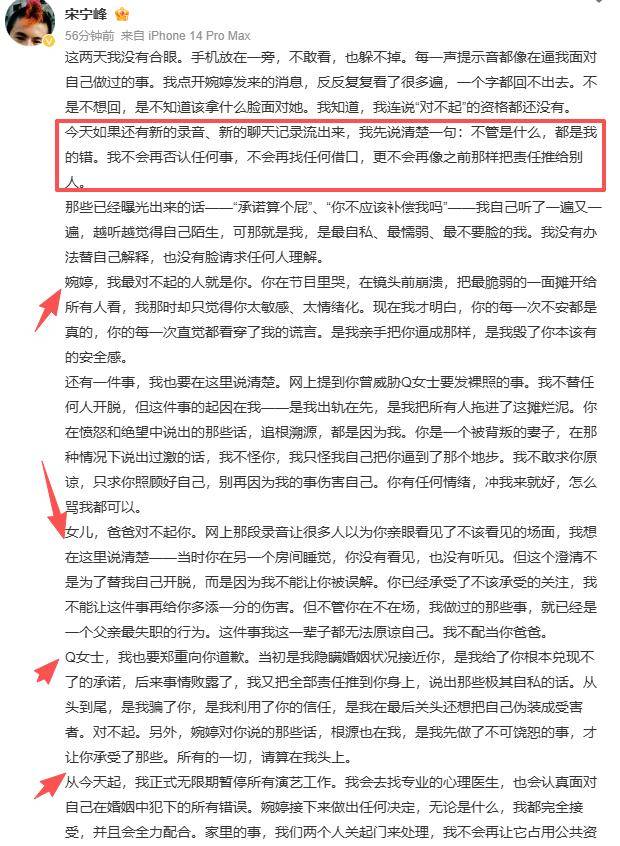 在这篇长文中,宋宁峰几乎都在道歉,也在崩溃。
