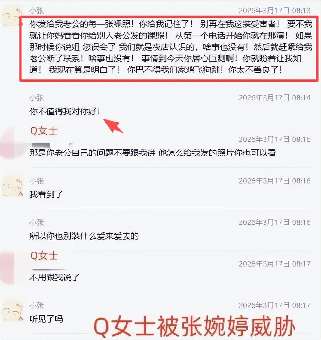 在这段聊天消息中,张婉婷直接威胁要将Q小姐的大尺度照片发给其家人。