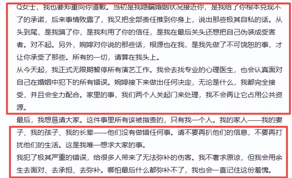 对于Q小姐,他也郑重道歉,是他最开始隐瞒了婚姻状态接近对方,也给了她兑现不了的承诺,这才让事情渐渐步入泥潭,不可自拔。