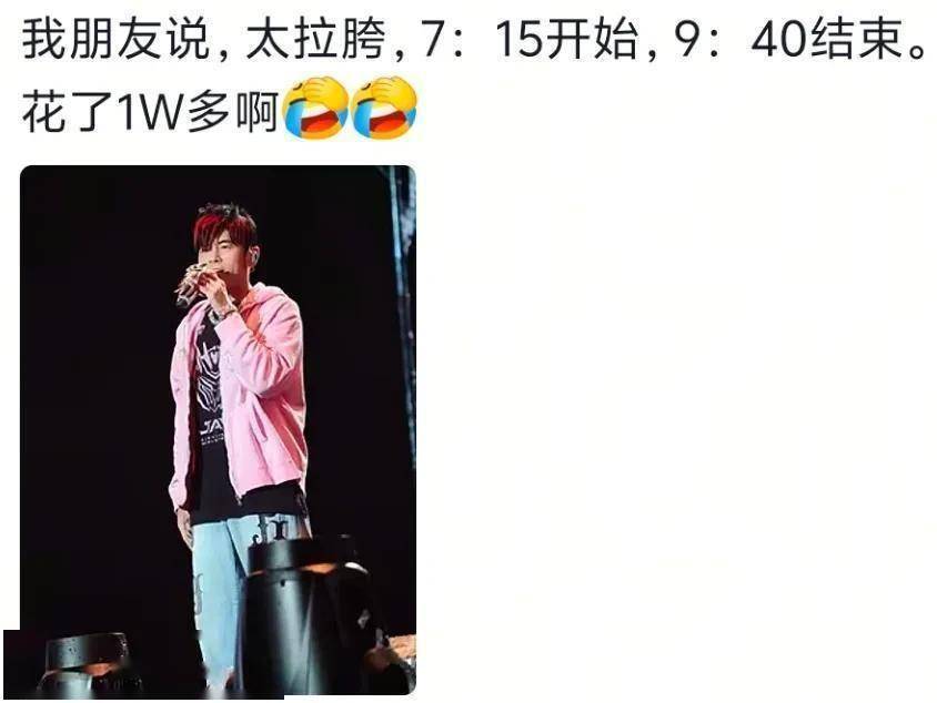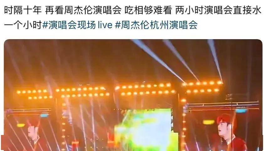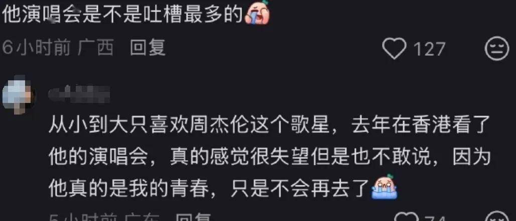 可当开场新歌《太阳之子》那句“我就是光”点燃全场的尖叫与泪光后,很多人心里的光,很快就熄灭了。 散场时,社交媒体上充满了心碎的声音。 有人说:“卖最贵的票,划最大的水。 ”有人说:“我可以接受他胖了、老了,但我接受不了的是,3小时你还光明正大划水2个小时。 ”更扎心的是这句:“从小到大只喜欢周杰伦这个歌星,去年在香港看了他的演唱会,真的感觉很失望但是也不敢说,因为他真的是我的青春,只是不会再去了。 ”