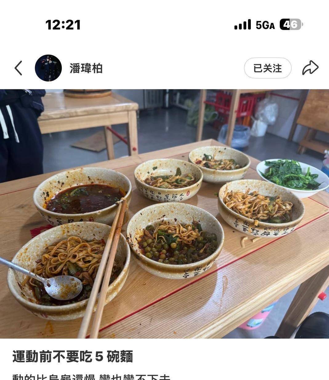 真正的挑战是第四碗,店里有名的“王辣面”。 整碗面被红彤彤的辣椒覆盖,视觉上就很有冲击力。 潘玮柏吃第一口前显得有些犹豫,但尝过之后便停不下来。 辣椒的香气很足,但辣度并不燥烈,反而让人越吃越上瘾。 吃到后半程,明显的辣意涌上来,他的鼻涕不受控制地流了下来,即便如此,手里的筷子也没停下。 最后,他用一碗“鸳鸯面”收尾,把辣味浇头和清淡的豌豆酱混合,凑齐了第五碗。 全部吃完后,他对着镜头笑了笑,给观众提了个建议:“建议大家不要像我这样点,因为到最后会冷掉,其实最好是吃完一碗再叫一碗。 ”评论区很快有网友回应:“不需要建议,一般我们都只吃一碗。 ”