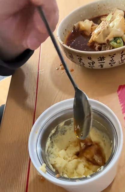 镜头前,潘玮柏的眼睛盯着菜单发亮。 他坐下后点的第一样东西不是面,而是一份哨子蒸蛋和一碗红油抄手。 蒸蛋刚上桌,他就迫不及待地拿起勺子。 蒸蛋嫩滑,肉末炖得软烂,汤汁完全渗了进去。 他一边吃一边发出含糊的赞叹,嘴里塞得鼓鼓囊囊,还顺手往蒸蛋里淋了两勺红油。 抄手皮薄,馅料实在,吸饱了红油汤汁,和蒸蛋搭配着吃。 对于饭量小的人来说,这两份下肚已经足够,但对潘玮柏而言,这只是开场。