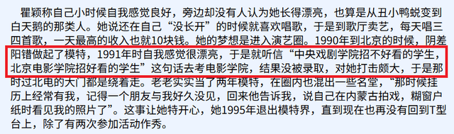 瞿颖从小就自我感觉良好,1991年,更是因为听信“中央戏剧学院招不好看的学生,北京电影学院招好看的学生”这句话去考电影学院,被淘汰后的很长一段时间,她路过北电的大门都是绕着走。